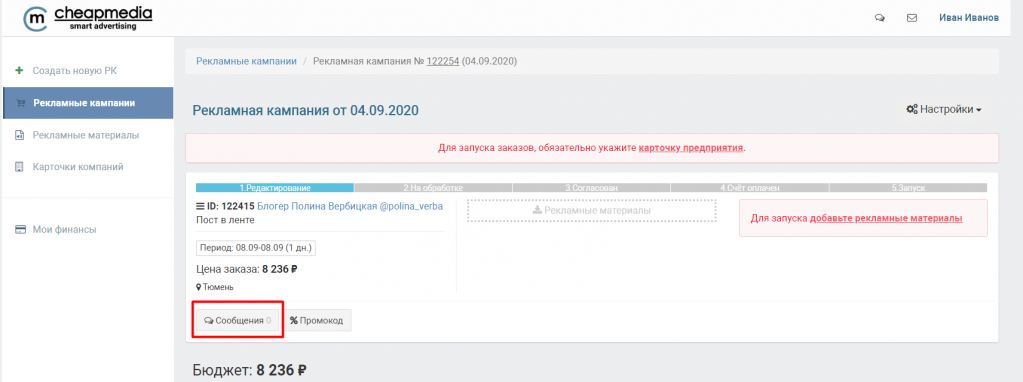 Все переговоры с селлером ведутся через личный кабинет рекламной платформы cheapmedia.ru